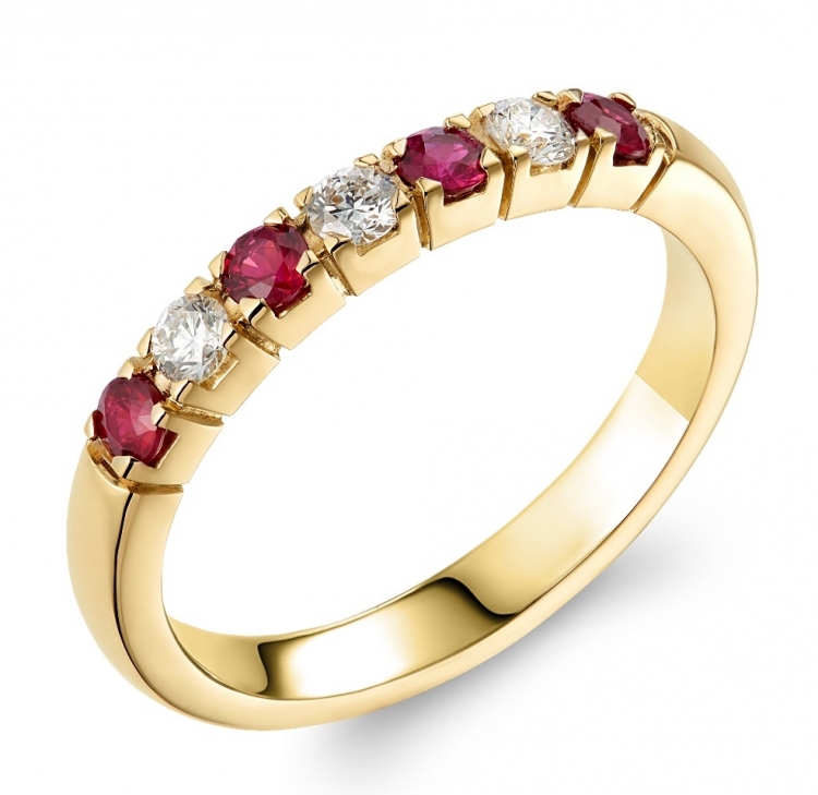 A 7 stone Ruby and Diamond castle set half-eternity ring in 18ct Yellow Gold.