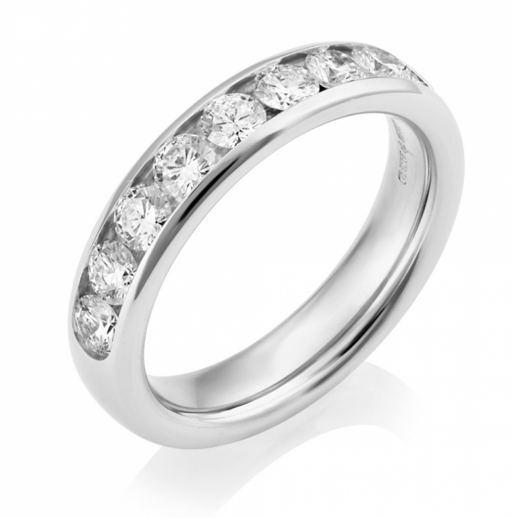 One carat of round brilliant G VS diamonds are channel set in this half-eternity Platinum ring, that has understated opulence and makes the viewer have to look twice. Made by Charles Green, a Birmingham based manufacturing jewellers since 1824