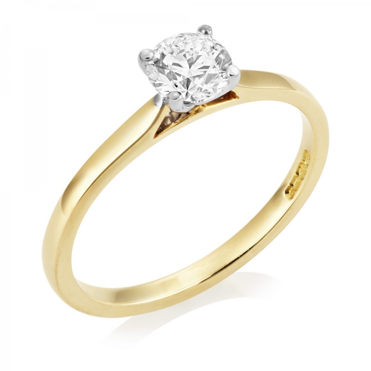 A classic 4-claw set Round Brilliant Solitaire Engagement Ring with a half carat F Colour diamond, in an 18ct White Gold setting and an 18ct Yellow Gold band. The diamond comes with a GIA certificate (Gemological Institute of America).