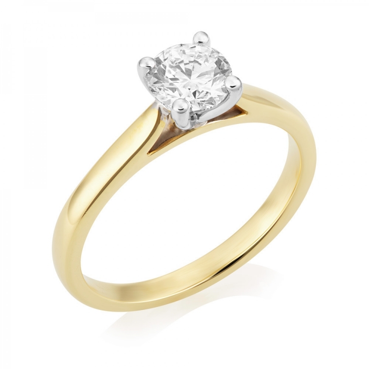 A classic 4-claw set Round Brilliant Solitaire Engagement Ring with a 0.70ct E Colour diamond VS2 clarity, in a platinum setting and an 18ct Yellow Gold band. The diamond comes with a GIA certificate (Gemological Institute of America).