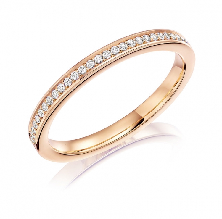 Using a 2mm wide flat court, this ring is set with 25 x 0.005ct diamonds half way round.