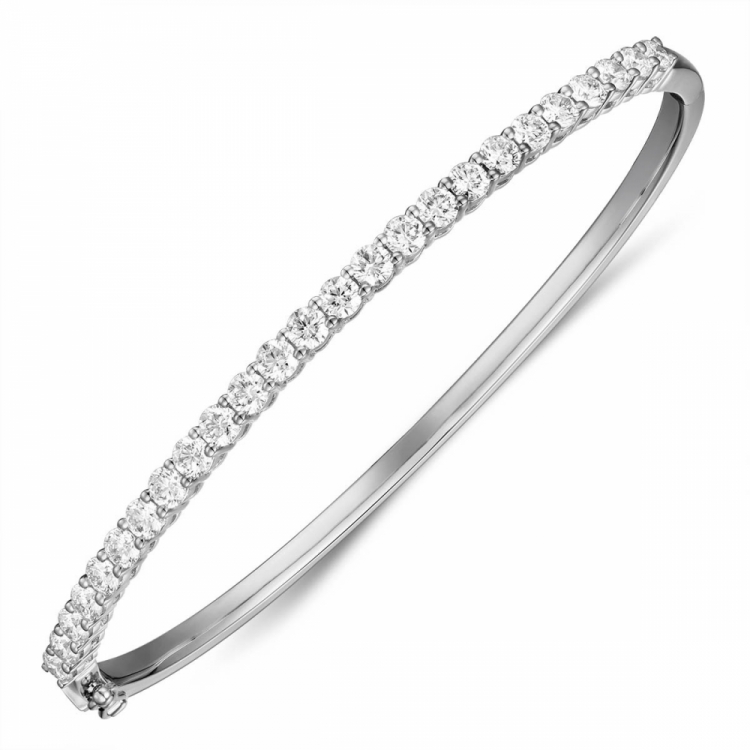A slender arc of claw-set round brilliant diamonds to grace the wrist and catch the eye, this hinged bangle in 18ct White Gold by Sheldon Bloomfield allows for a closer fit. The diamonds have a G colour and a VS clarity, giving a crisp, white glittering finish.