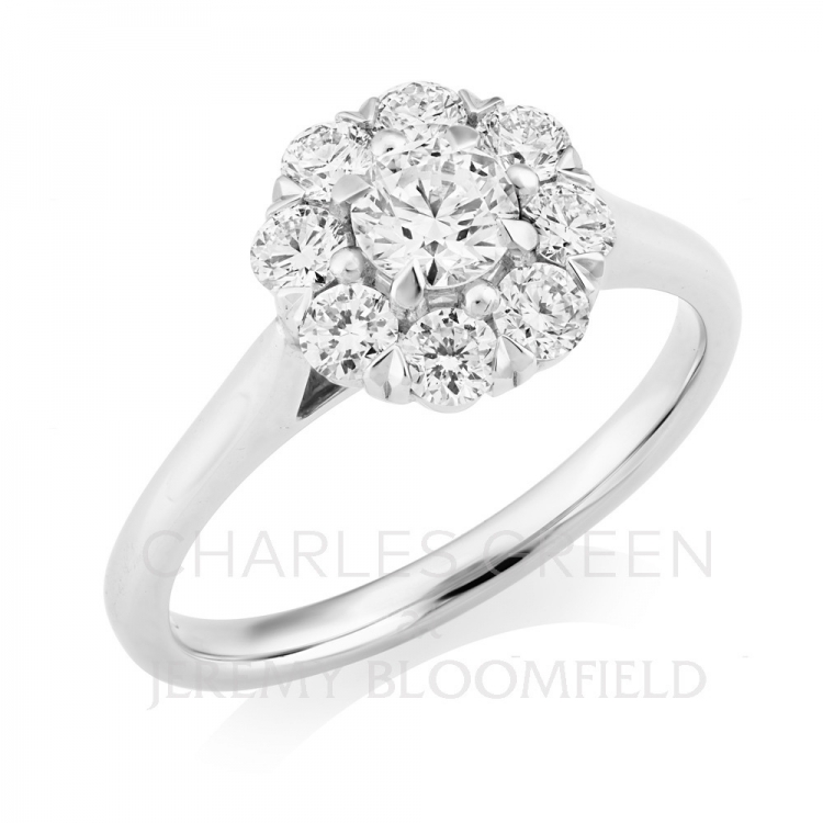 A round brilliant cut diamond forms the centrepiece in a glittering halo of smaller diamonds, resembling a diamond flower in this resplendent ring from Charles Green.