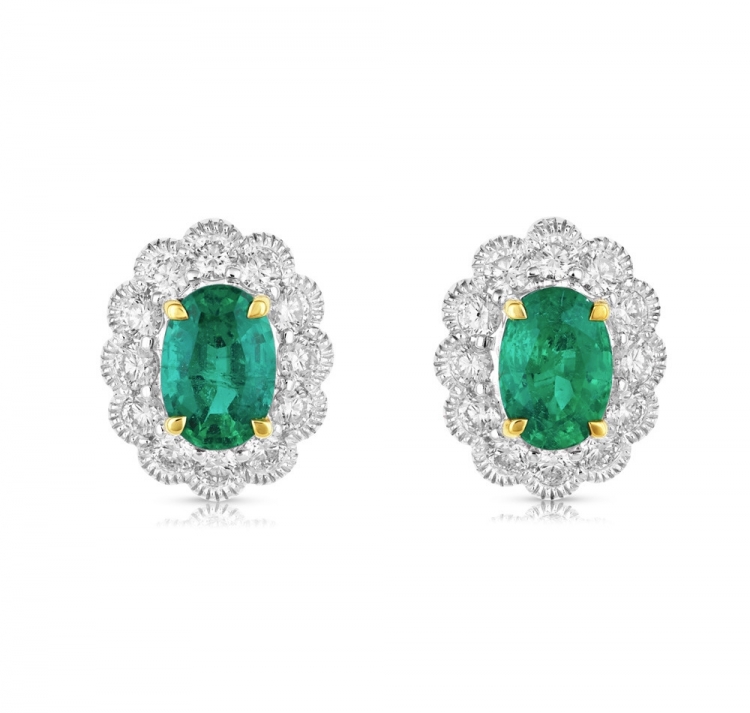 Vintage styling is one of Sheldon Bloomfield’s specialities. Each earring features crisp white diamonds held in a scalloped frame of 18ct White Gold surrounding a piquant oval Emerald Round. With the added detail of 18ct yellow gold claws,these are very reminiscent of Empire style earrings.