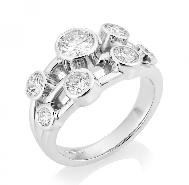 Round Brilliants of varying sizes, totalling over one and a half carats, each with individual rub-over settings are brought together in this modern and exuberant platinum Bubble ring.