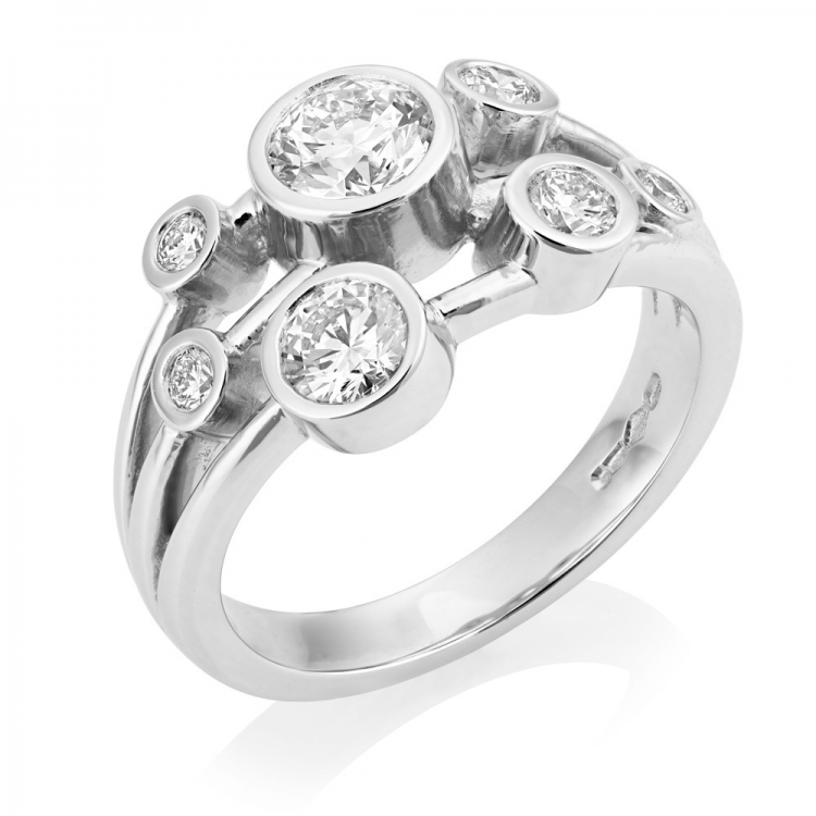 Round Brilliant Diamonds of varying sizes, a carat in total, each with individual rub-over settings are brought together in this modern and exuberant platinum Bubble ring.