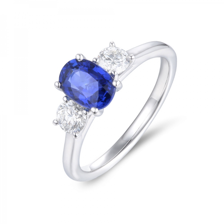 A deeply rich 1.48ct Oval cut Sapphir nestled between two crisp, white