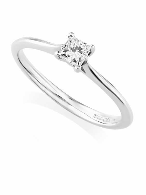 The princess cut diamond has a weight of 0.25ct, a colour of F, and a clarity of VVS2.