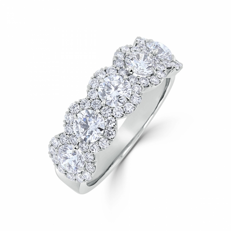 A luxurious 5 stone round brilliant diamond halo platinum ring from the UK workshops of Charles Green.