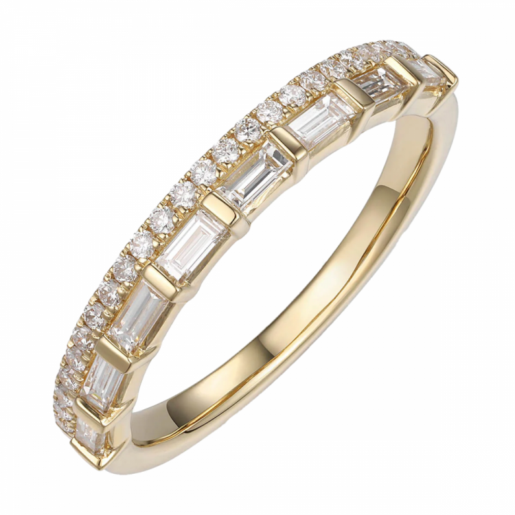 18ct yellow gold and diamond double row half eternity ring by Sheldon Bloomfield. The diamonds are Emerald and Brilliant cut, G in colour, VS in clarity and a total of 0.49cts in weight.